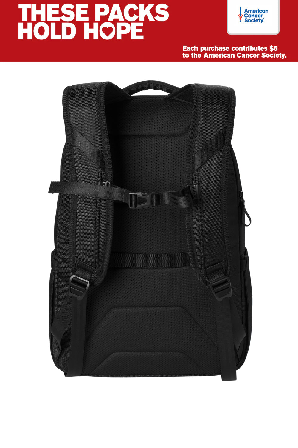 Designed for travel or the daily commute, this durable pack protects your tech and organizes essentials while showing your commitment to helping people in need. Designed to support the American Cancer Society, each tech pack has a label with a QR code that can be scanned to learn more about the charity, their mission and donation opportunities.